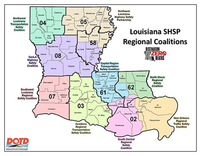Local stakeholder participation is vital in implementing the vision of Destination Zero Deaths. To accelerate the State Highway Safety Plan’s project implementation at the local level, Louisiana established nine Regional Transportation Safety Coalitions through an agreement between DOTD and the designated Regional Planning Commission (RPC) or the Metropolitan Planning Organization (MPO). The DOTD has District Offices that work closely with the MPOs and State Police Troops. Each coalition is led by a coordinator who serves as liaison between the state and local partners from all 4E’s of Safety: Engineering, Education, Enforcement and Emergency Medical Services. The Acadiana Regional Transportation Safety Coalition is led by Ron Czajkowski. Contact us to be added to our mailing list and meeting invite list: rczajkowski@planacadiana.org or (337) 806-9367.